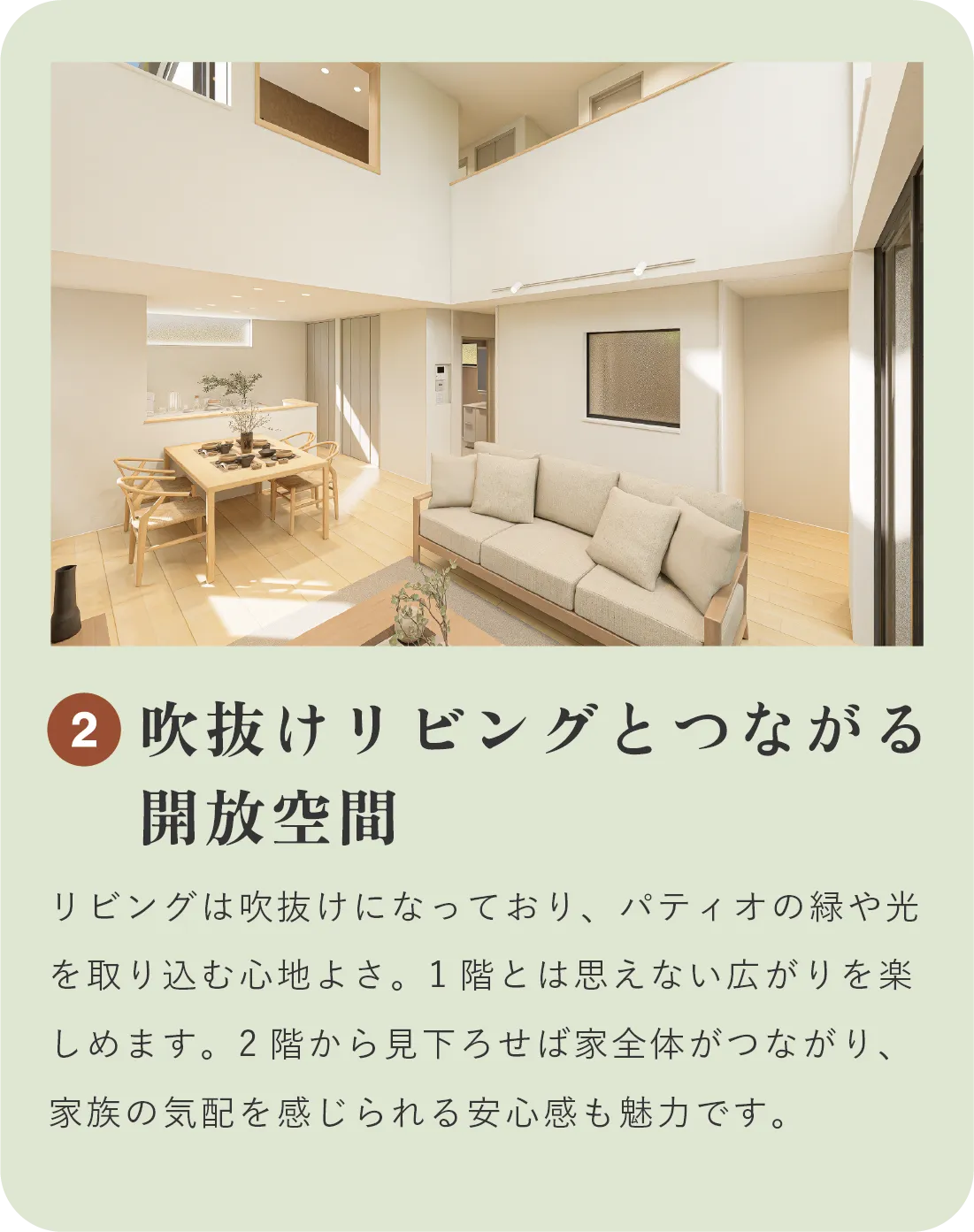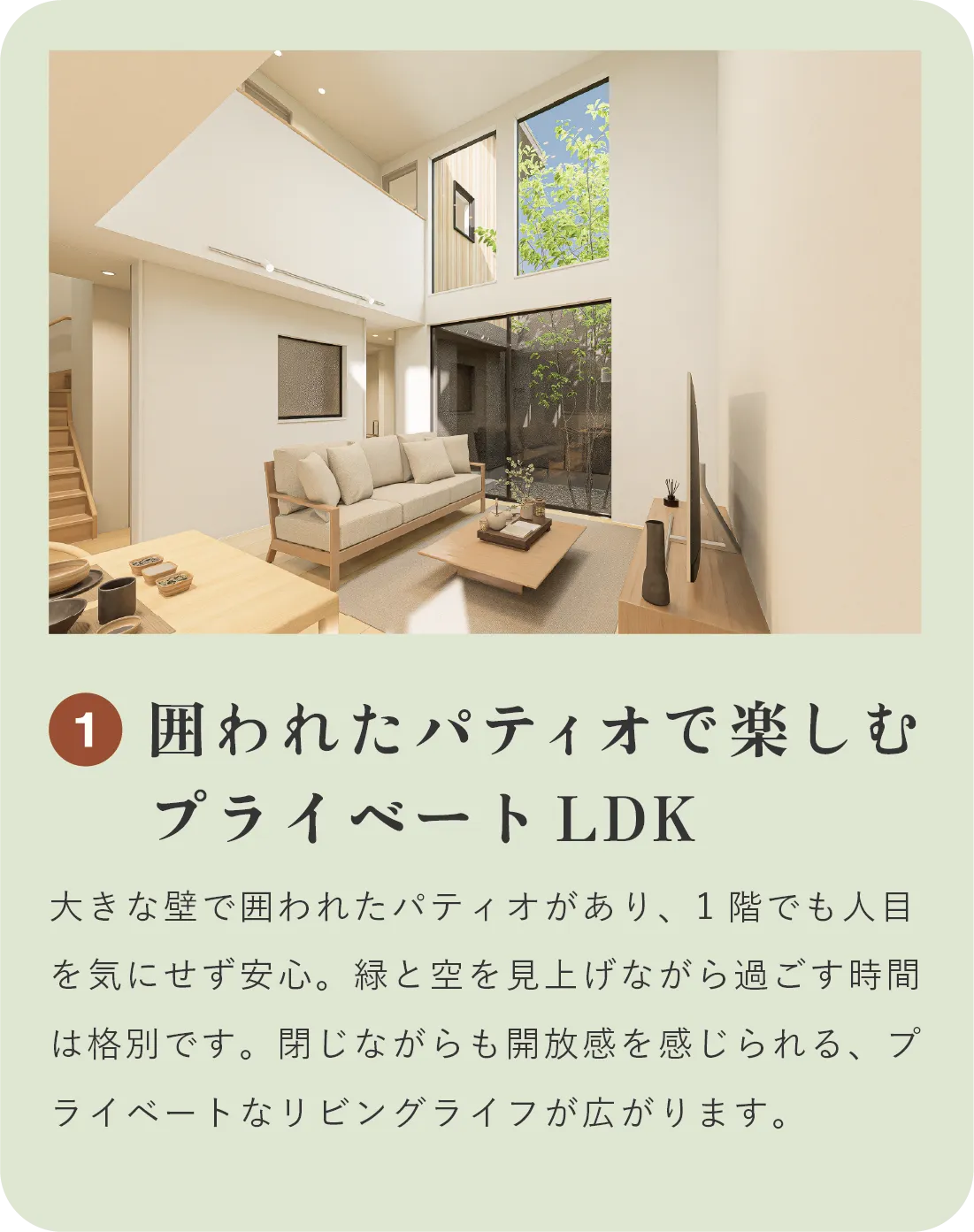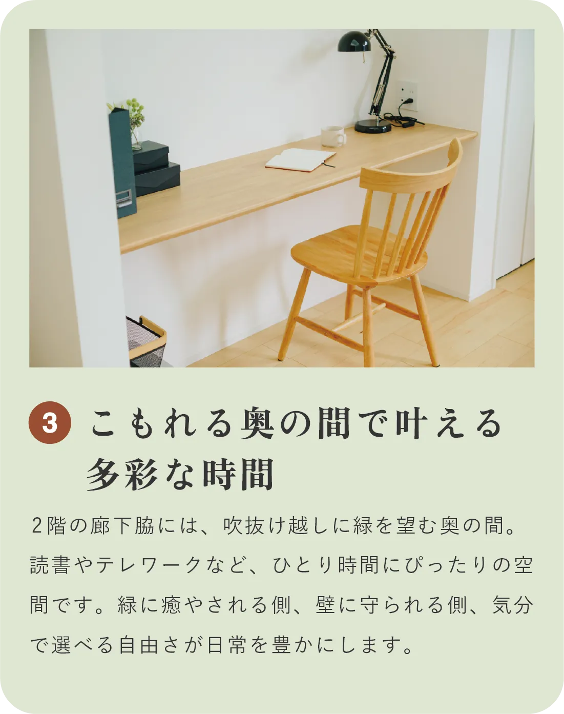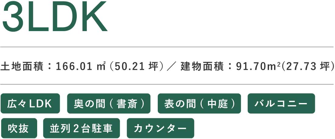 一般的な2階建てでは叶わない、もう一歩上の心地よさ。広さに余裕があるからこそ、窓の先には静かな庭が広がります。この家には、住む人の“余白”を大切にする設計があります。