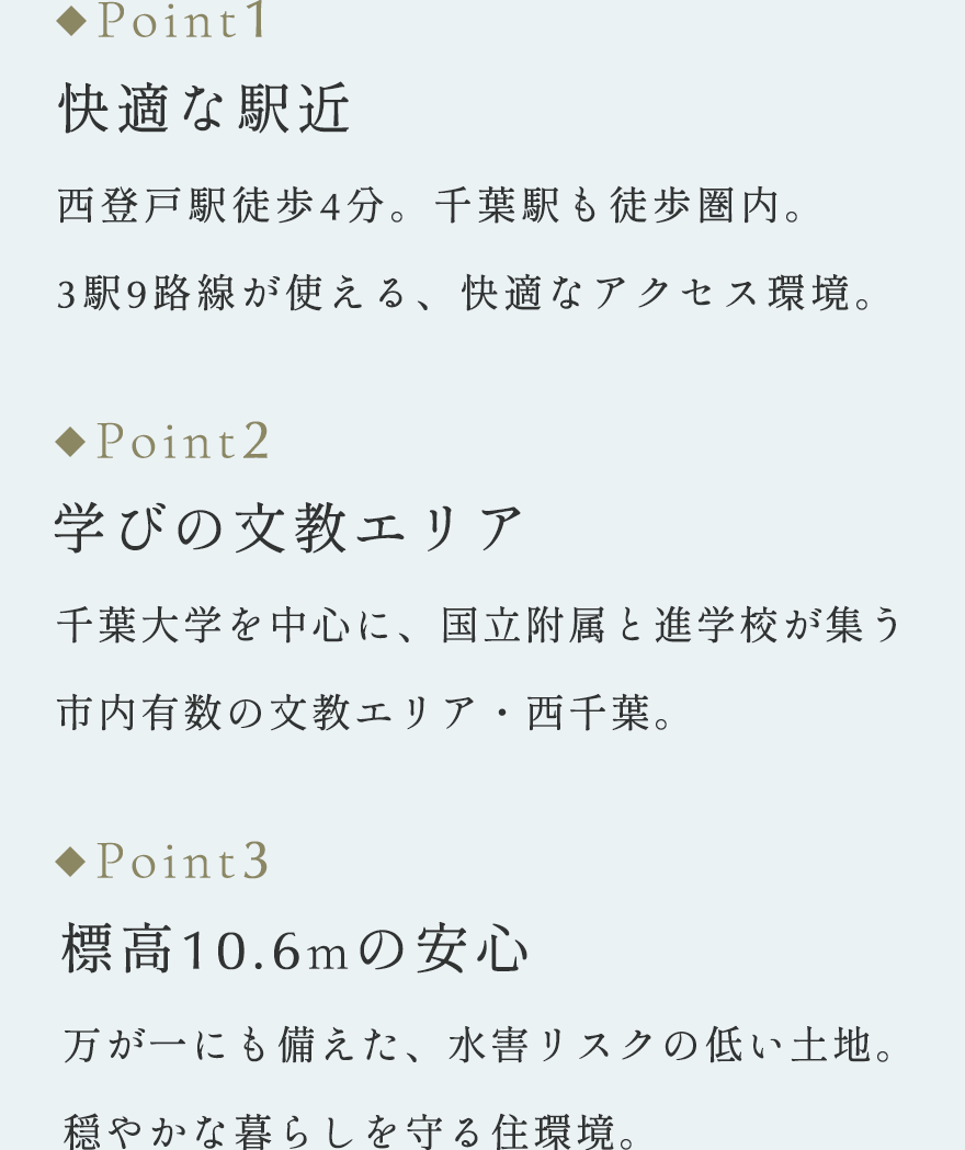 周辺には 千葉大学をはじめ、国立附属校や進学校が集まる、市内有数の文教エリア が広がり、