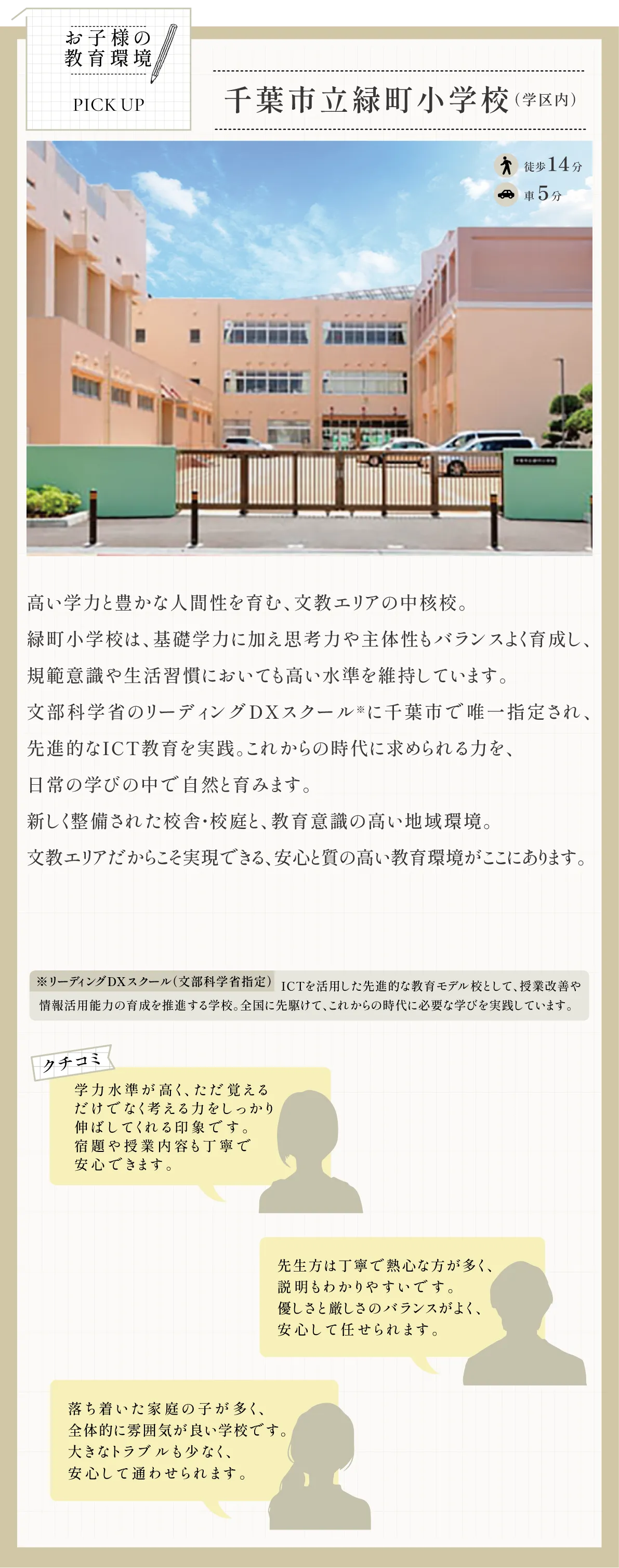 閑静な住環境と教育の魅力 が両立したロケーションです。