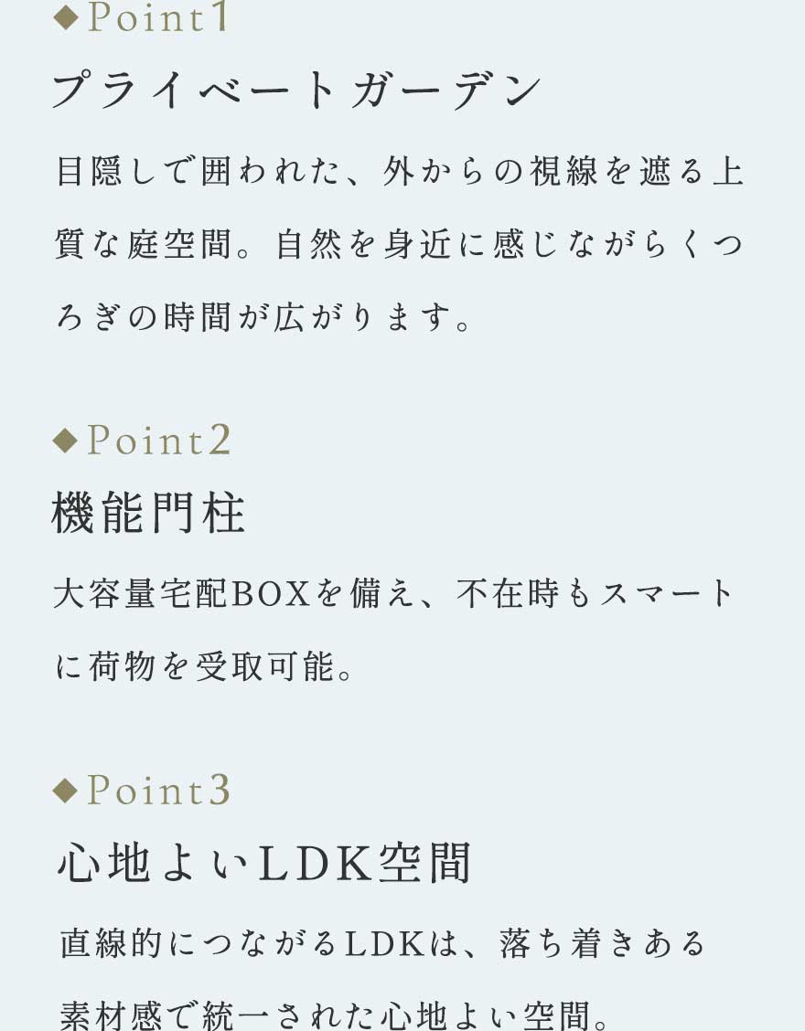 ※工法、設備使用、アフターサービスは、分譲地や各邸ごとに異なる場合がございます。