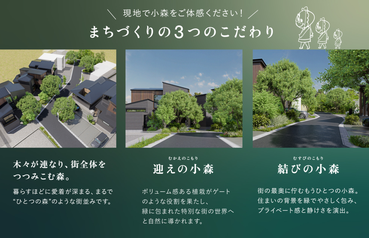 森のある分譲地なら、外遊びやお散歩がぐっと身近に。 車通りが少ないゲーテッドタウンだから、お子様の自然体験やペットとの時間も、安心して楽しめます。